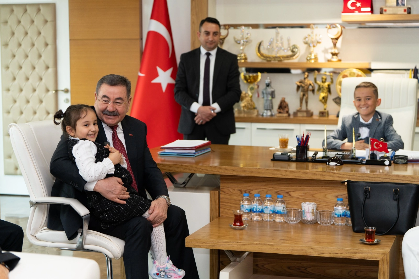 Odabaşı tarafından kapıda karşılanan minik başkana çeşitli hediyeler takdim edilirken, Yusuf Alp Sarışık da Odabaşı’na hediye sundu.