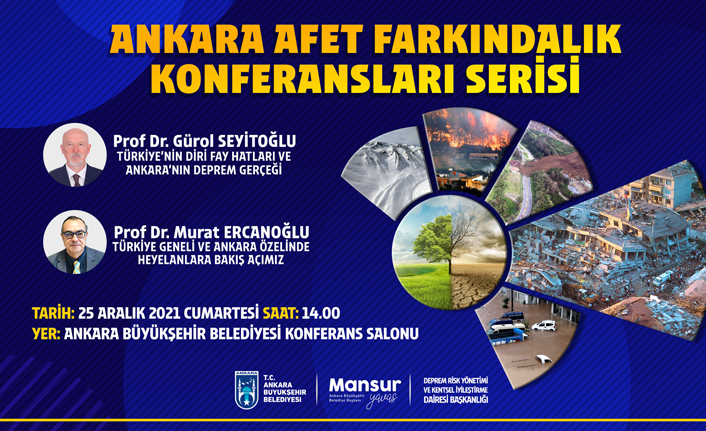 Prof. Dr. Gürol Seyitoğlu’nun “Türkiye’nin Diri Fay Hatları ve Ankara’nın Deprem Gerçeği” ile Prof. Dr. Murat Ercanoğlu’nun “Türkiye Geneli ve Ankara Özelinde Heyelanlara Bakış Açımız” konu başlıklarıyla konuşmacı olarak katkı sağlayacağı konferanslar serisinin ilki, 25 Aralık 2021 Cumartesi günü saat 14.00’te Büyükşehir Belediyesi Konferans Salonu’nda halka açık olarak gerçekleştirilecek.
